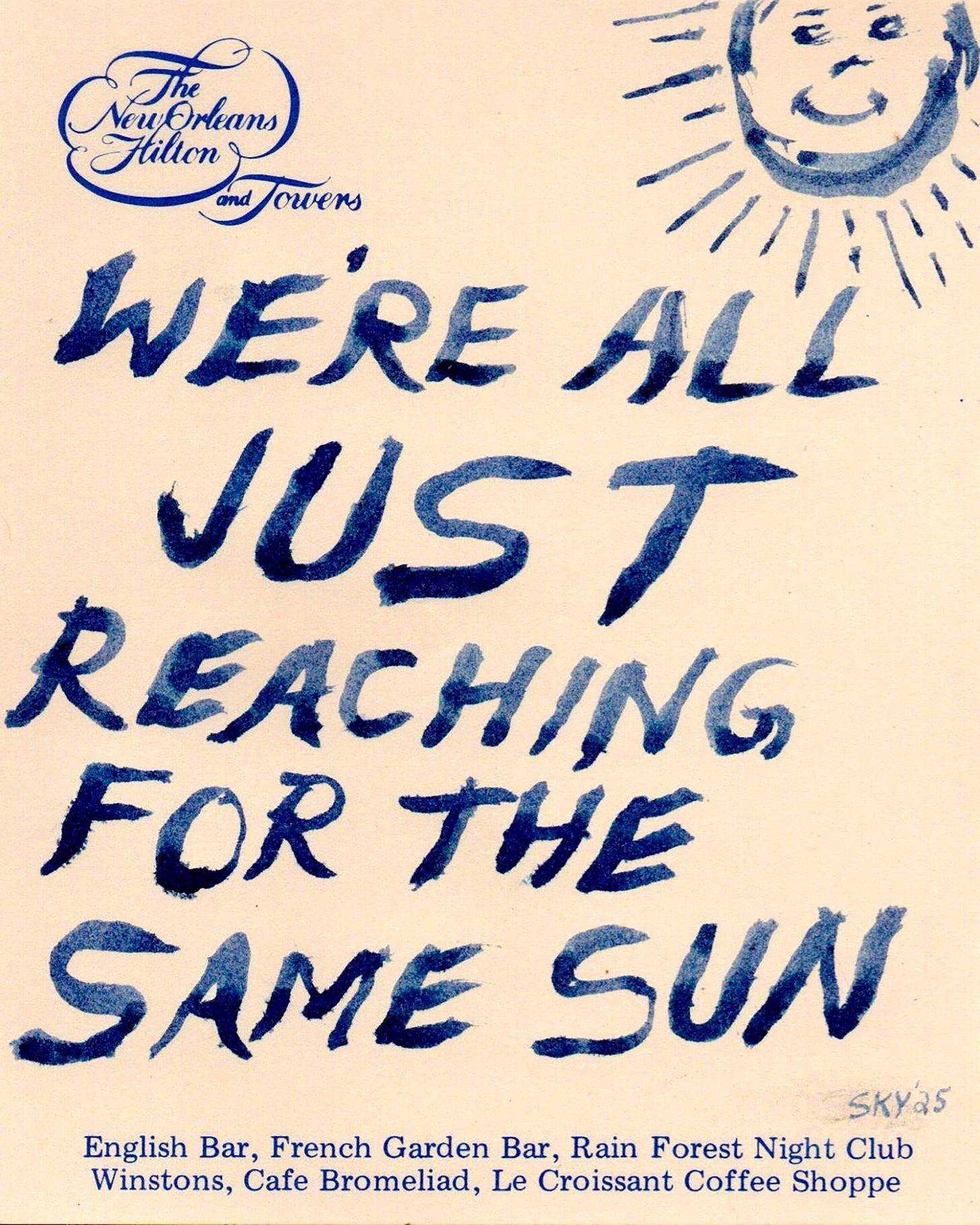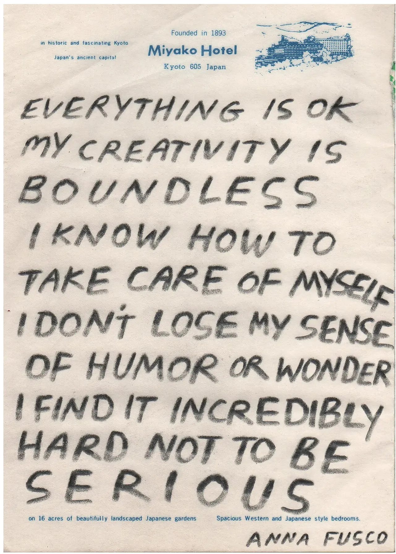 speaks to in Big Magic: ideas are conscious, and sometimes impatient. They show little mercy for hesitation, and ruthlessly move on to another host without warning. It’s annoying when this happens, but ultimately I have nobody to blame besides myself. Plus, I’m comforted to know that in this business of ideas, there’s more going on than meets the eye.Direct Imitation: The second instance is when I discover that somebody who admires and engages with my work has created a piece of art using my moxie. It's easy to replicate: find a piece of trashed paper or hotel stationery and, in an interesting typeface, write a paradoxically universal and esoteric musing on it by hand.